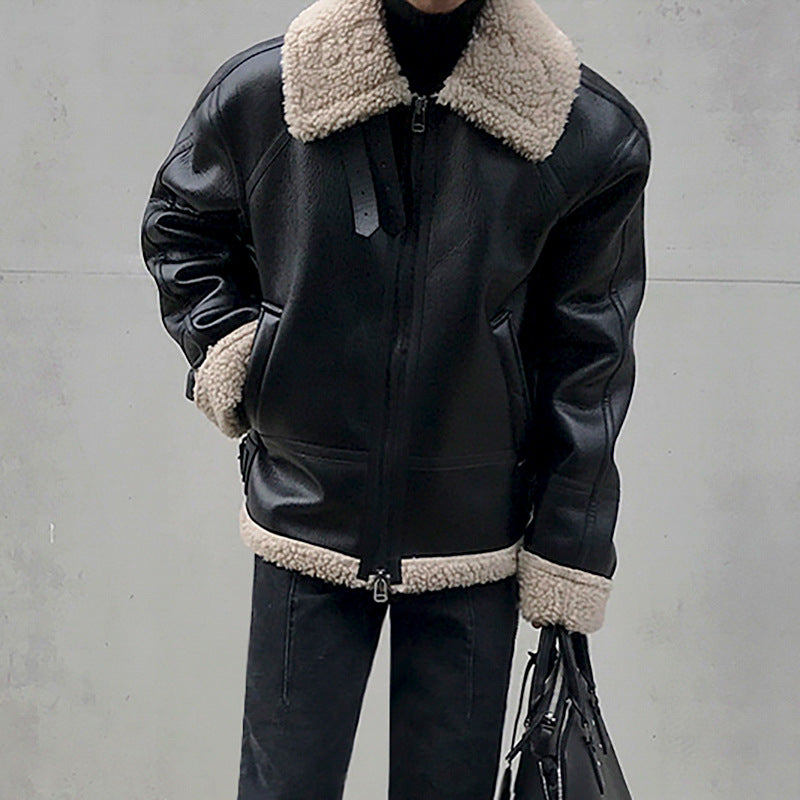 Classic Korean standing locomotive jacket winter plus velvet thickened skin mixed coat lamb hair sauna coat