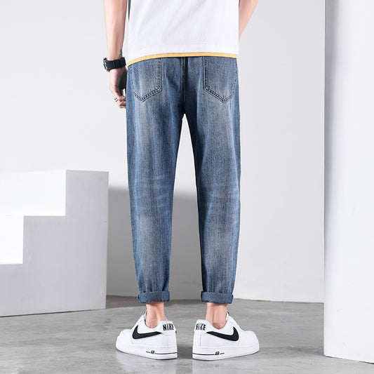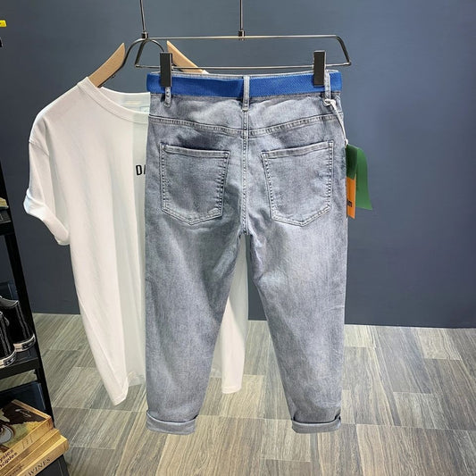 Light color nine-point jeans men 2021 new tide card autumn thin section slim pants belt long pants
