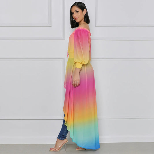 234 Gradient Dress Autumn Chiffon French Long Dress Ruffle Strapless Waist Long Sleeve Fairy Dress Temperament