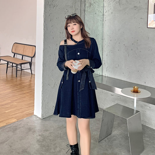 Shuangfu Korean version of the solid color plus fat large size women's autumn chubby mm light cooked new long-sleeved dress K315