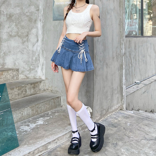 2021 new denim half-length short skirt European INS wind high waist film thin tie roller leaf A word pleated skirt