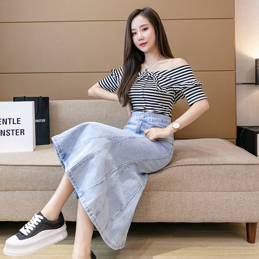 Cowboy skirt female design high waist A word skirt lotus leaf side long bag hip fish tid skirt summer