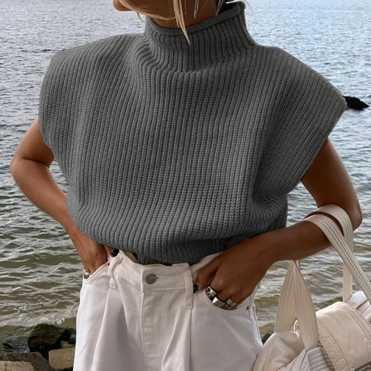 Women's Solid Color Turtleneck Sweater With Short Sleeves Top