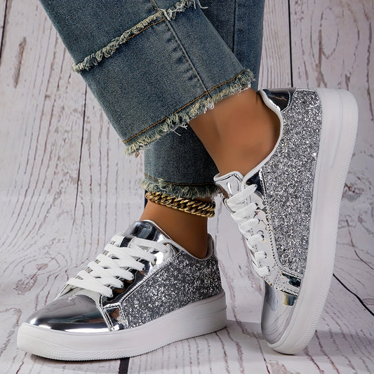 Women's Solid Color Trendy Sneakers, Lace Up Sequins Pattern Casual Skate Shoes, Glitter Low-top Shoes for Music Festival