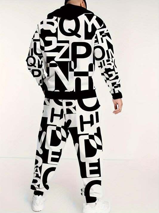 Plus Size Men's Letters Graphic Print Hooded Sweatshirt & Pants Set For Spring Fall