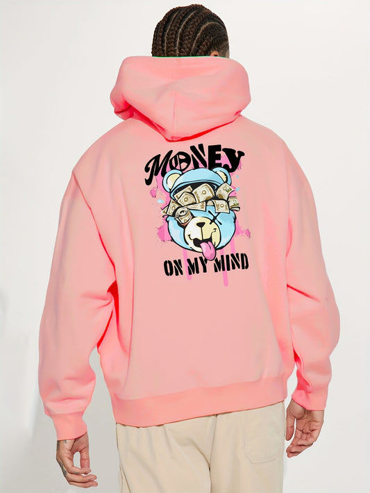 Stampa Orso Soldi Sul Pullover Da Uomo Con Cappuccio A Collo Rotondo E Tasca Canguro. Maglia A Maniche Lunghe E Cappuccio, Top Casual E Comodo Per L'autunno E L'inverno. Abbigliamento Da Uomo Come Regalo.