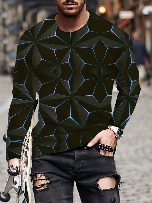 Dazzling 3D Geometric Print Men's Long Sleeve Fit Slim T-shirt, Spring Fall