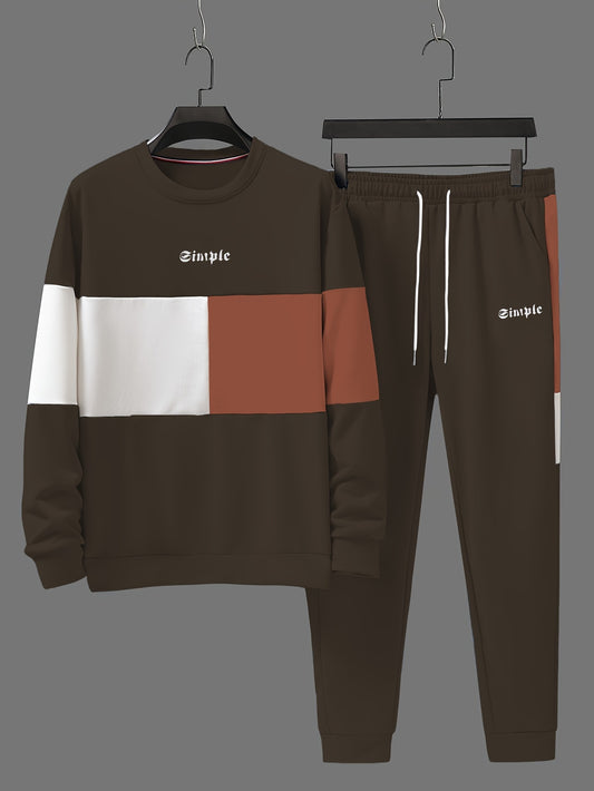 Plus Size Men's "Simple" Print Sweatshirt & Sweatpants Set For Autumn/winter, Contrast Color 2Pcs Outfits For Sports/outdoor, Men's Clothing
