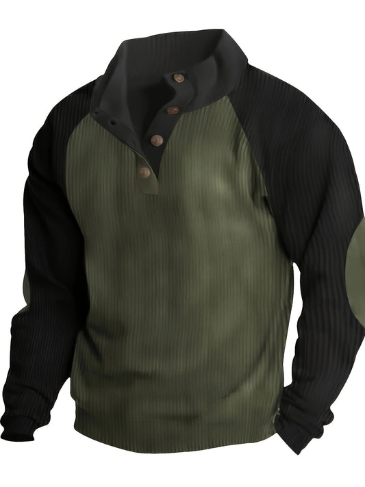 Men's Casual Color Block Corduroy Stand Collar Sweatshirt, Chic 1/4 Button Long Sleeve Pullover Sports Tops