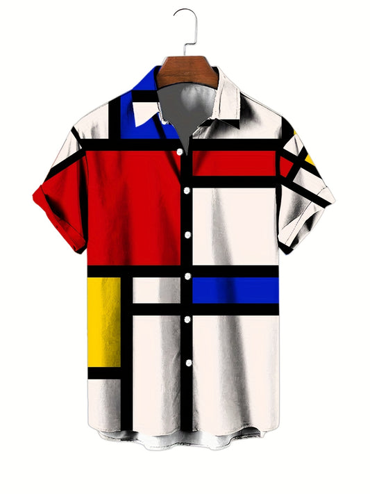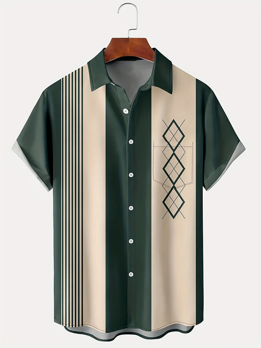 Vintage Bowling Geometric Graphic Print Fashion Hawaiian Shirt, Comfy Men's Button Up Shirt With Pocket, Plus Size Men Clothes