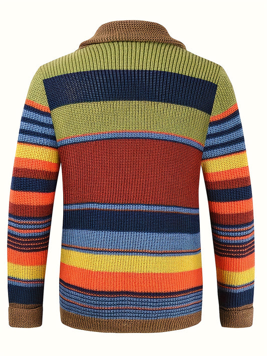 Elegant Retro Button Up Slightly Stretch Cardigan Jacket, Men's Casual Color Block Vintage Style V Neck Sweater Cardigan Coat For Fall Winter