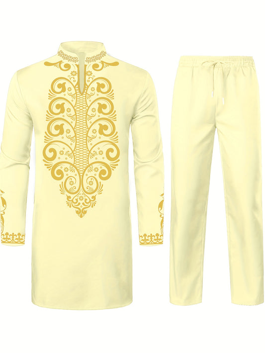 Men's African 2Pcs Set, Ethnic Traditional Tunic Floral Print Top & Pants Set, Traditional Costume Clothing For Males, Plus Size