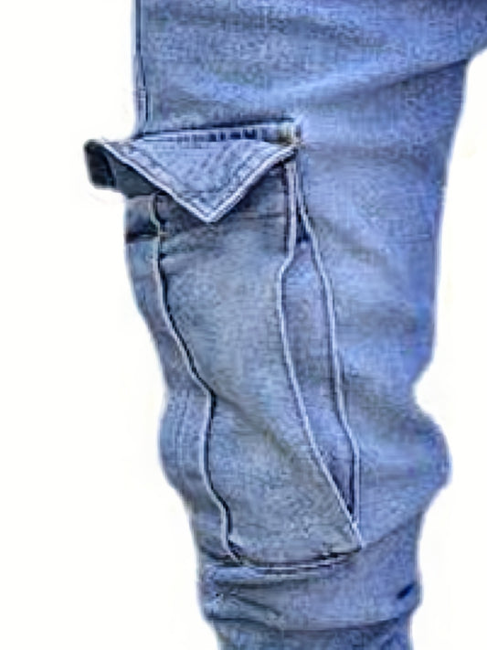 Slim Fit Flap Pocket Cargo Jeans, Men's Casual Solid Color Slightly Stretch Multi Pocket Denim Pants For Spring Summer