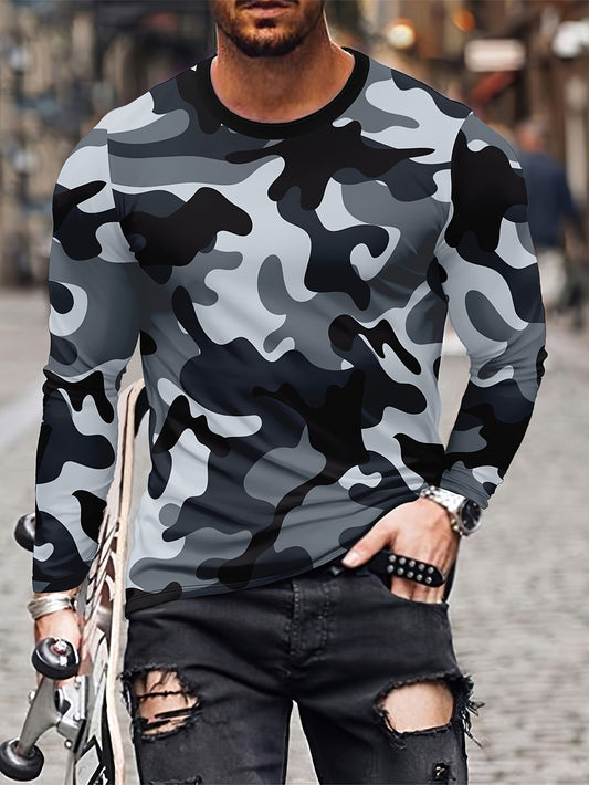 Camouflage Print, Men's Long Sleeve Novelty T-shirt, Stylish Tees For Autumn, Mens Clothing