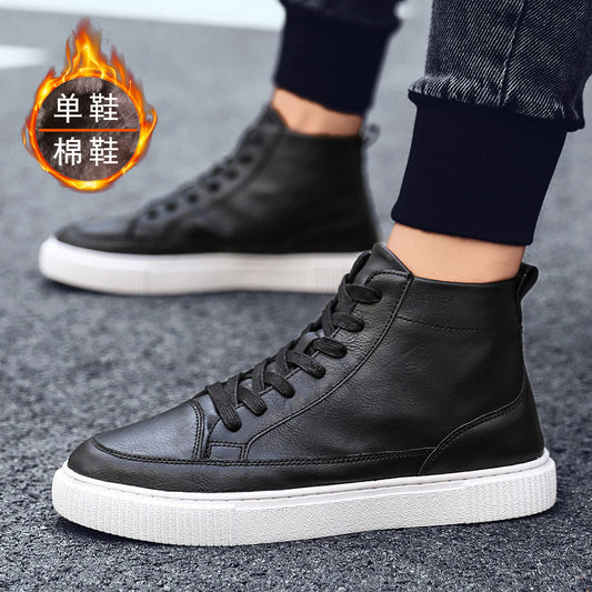 Leather shoes plus velvet warm high-top sneakers men's shoes autumn and winter men's casual Korean style sewing shoes all-match trendy shoes