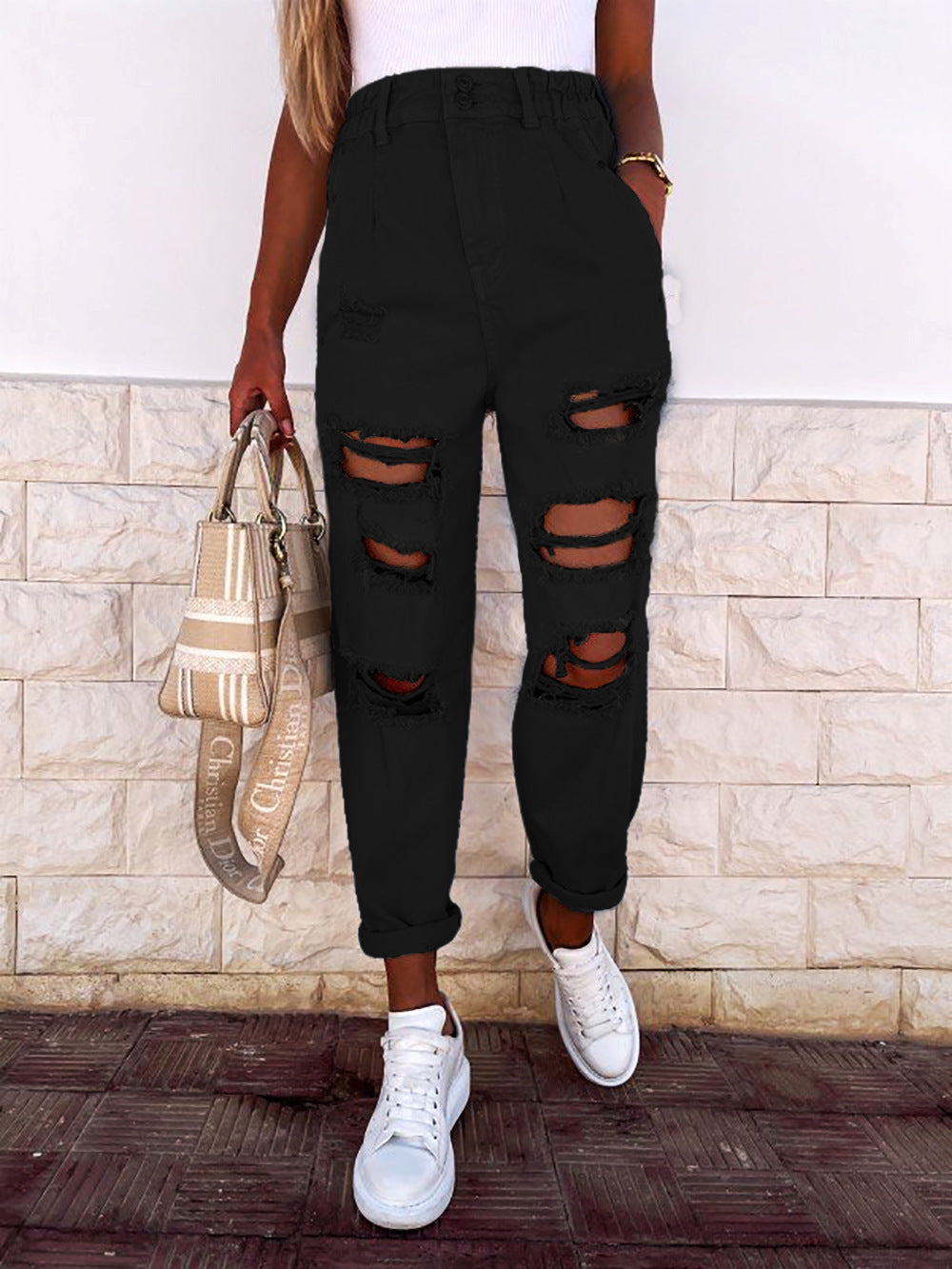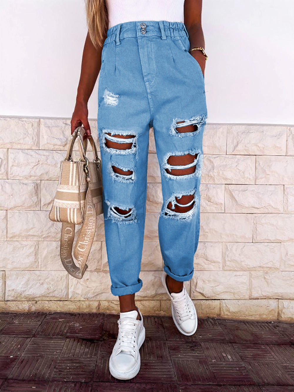 European and American cross-border autumn and winter new women's broken hole force tight waist high waist loose solid color straight jeans female