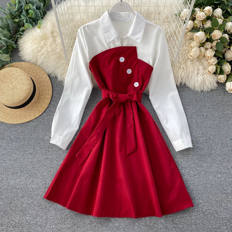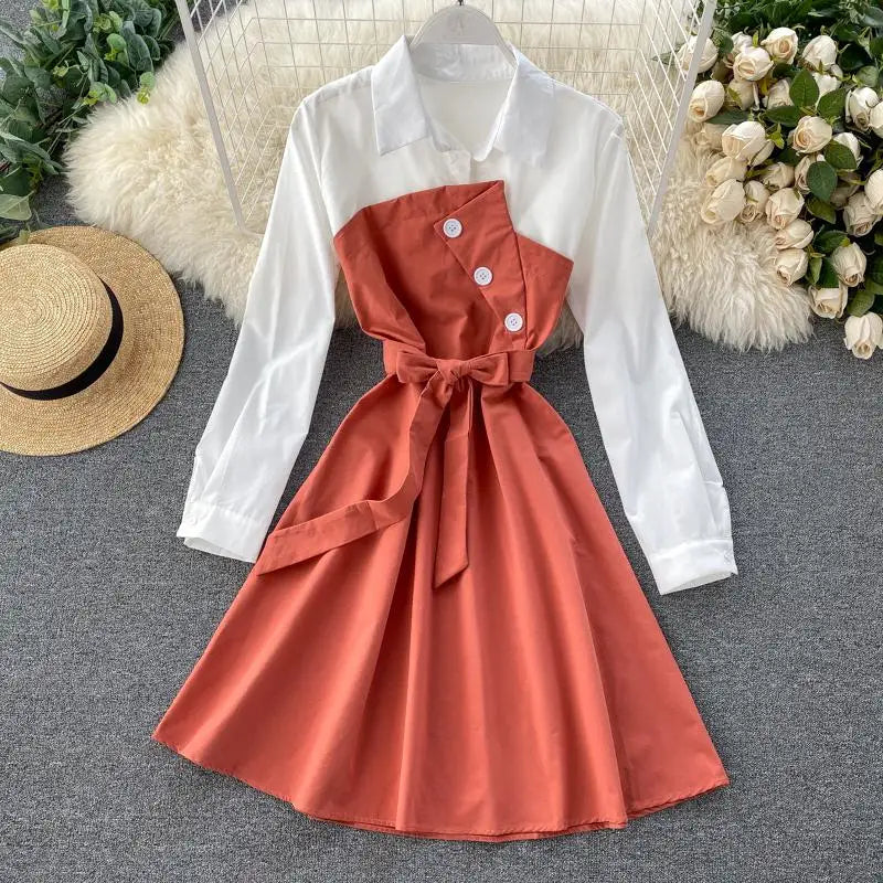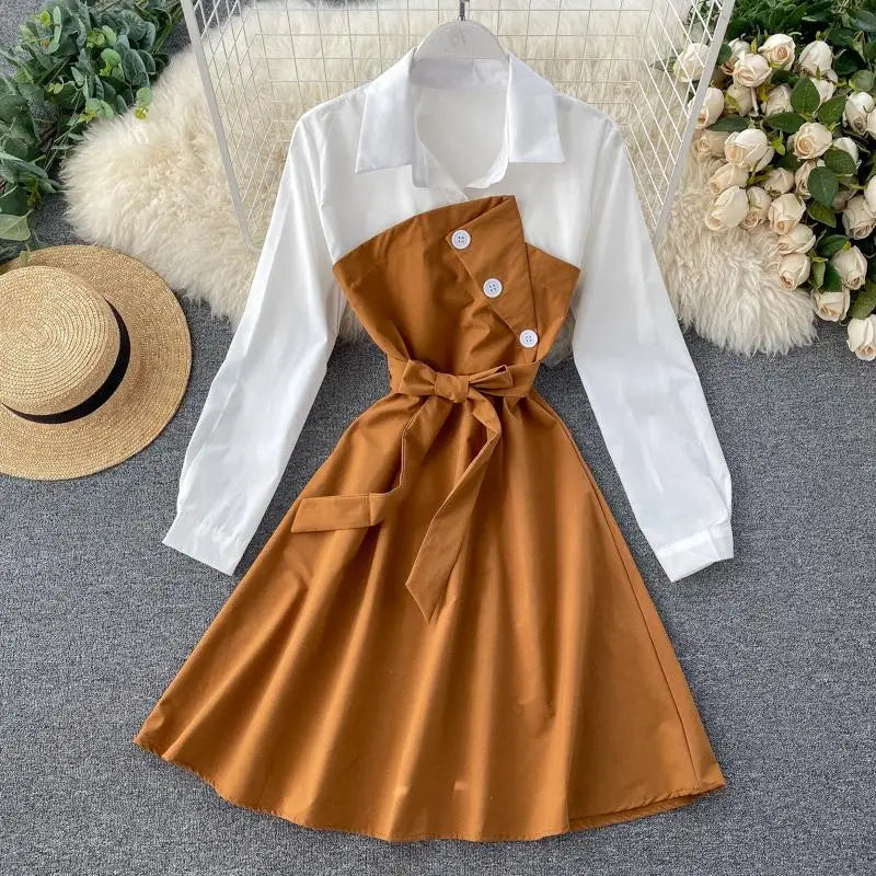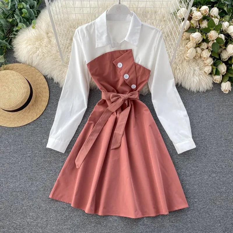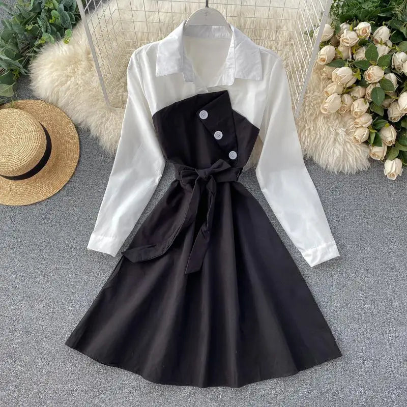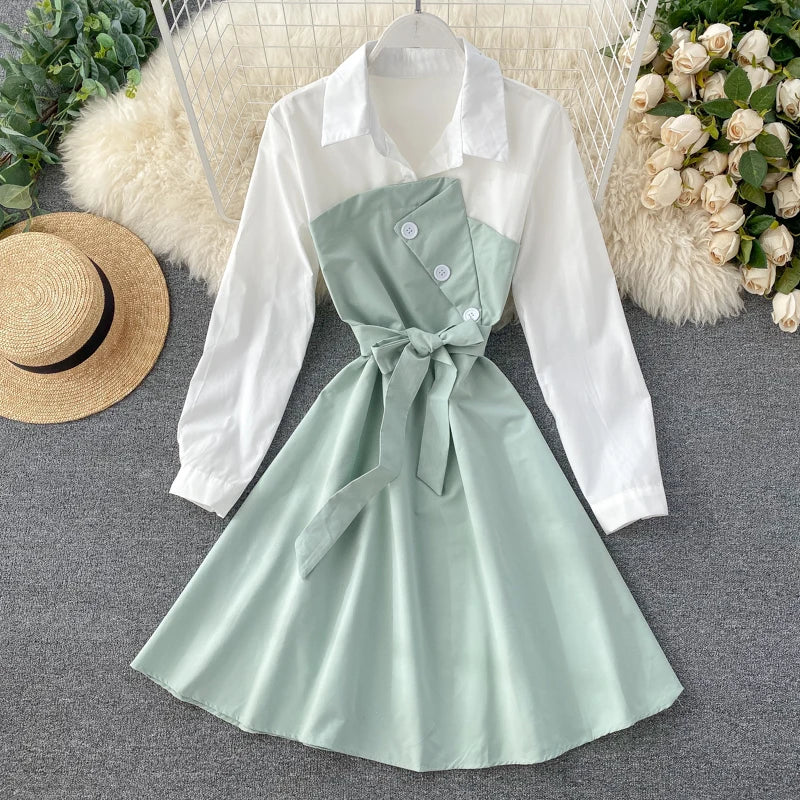 FTLZZ Women Casual Shirt Dress Spring Autumn Turn-down Collar Patchwork Button A-line Dress Sweet Female Vestido