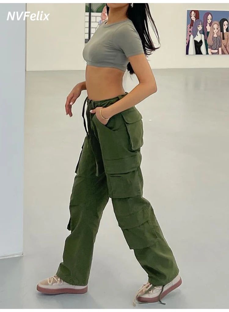 Hnewly Vintage Womens Pocket Cargo Jeans High Waist Baggy Straight Leg Comfy Casual Green Denim Female Trousers Fashion Hip Hop Style