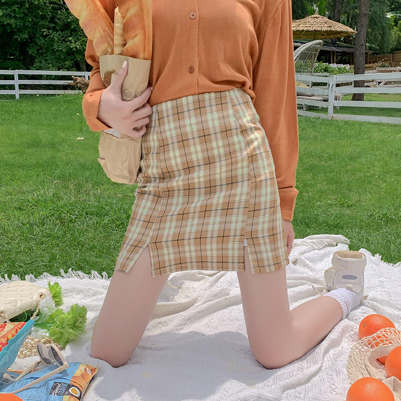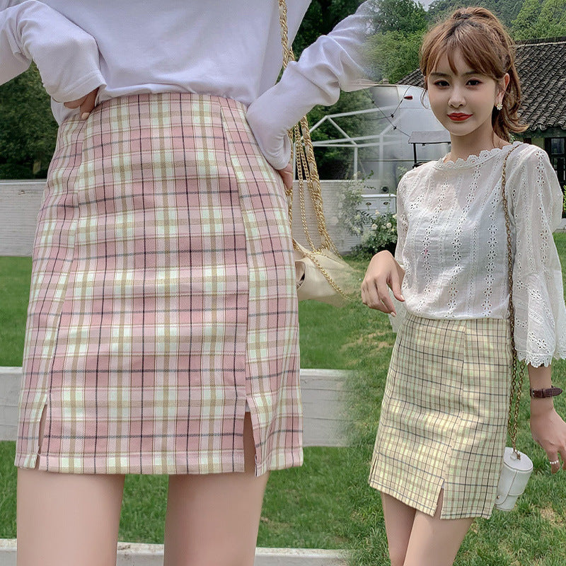 Plaid half-length skirt female skirt 2021 new skirt Korean version of the student wind lining high waist open A letter bag hip skirt