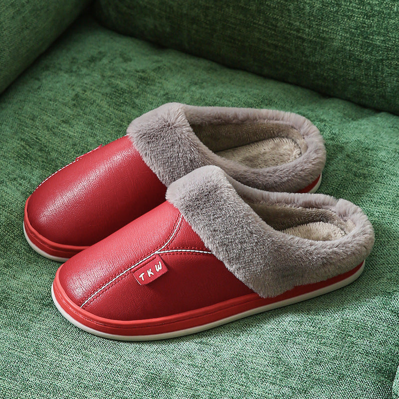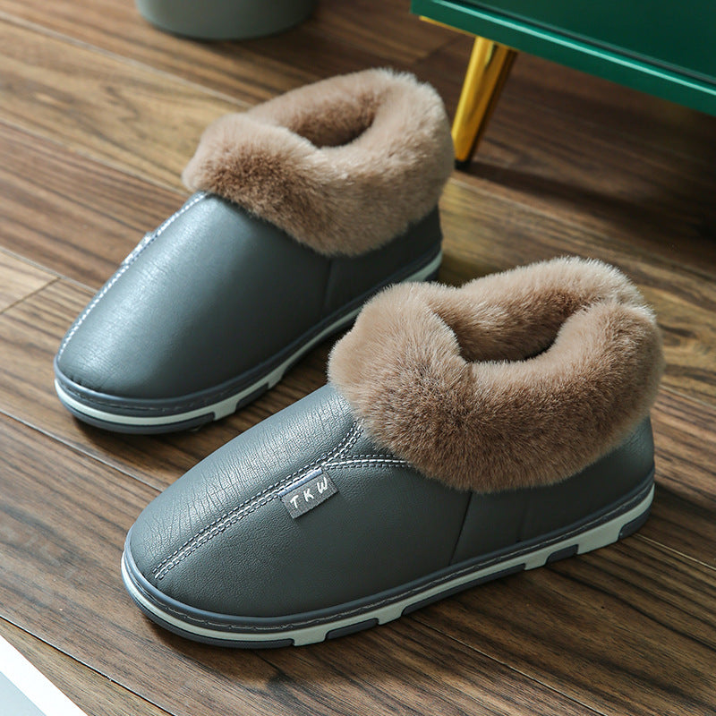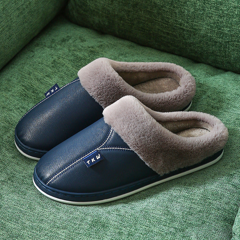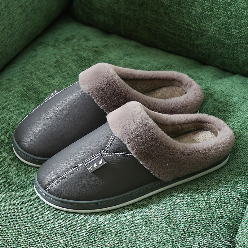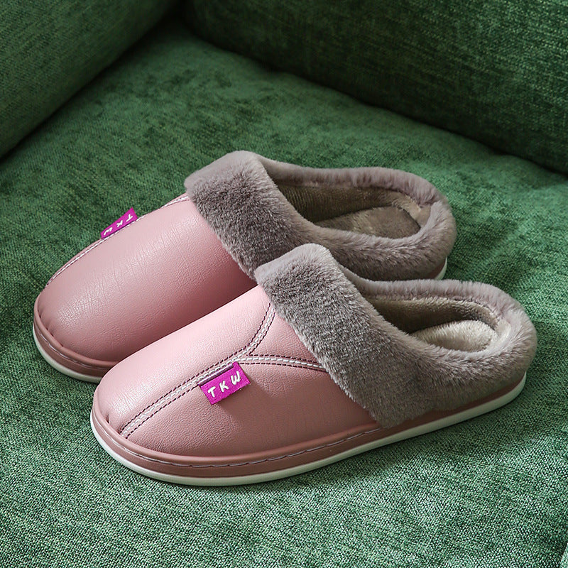 PU leather slippers female winter plus velvet soft bottom couple warm big gruff waterproof cotton slippers home with a male