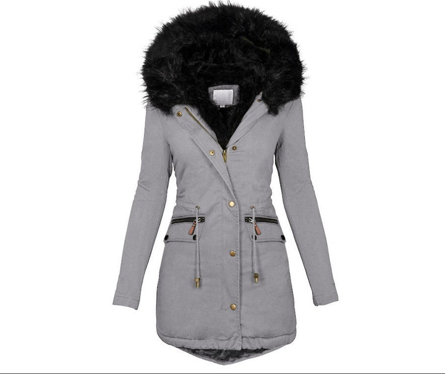 Women's Clothing Solid Color Fur Collar Hood Mid-length Thermal Cotton-padded Clothes Women